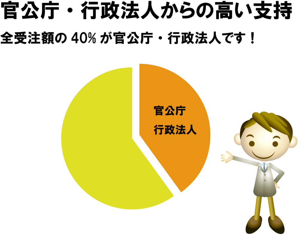 官公庁・行政法人・福祉団体から教育機関・飲食店・メーカーまで幅広い顧客の皆様からの様々なご要望にお応えしてまいりました。特に、官公庁・行政法人からの受注が全受注額の半数近くを占めており、様々なノウハウを蓄積しております。また、幅広い業務内容の担当スタッフ(ウェブデザイナー・エンジニア・イラストレーター・フォトグラファー)がいることから、レイアウト・デザインだけにとどまらず、写真撮影や原稿の作成を含め、トータルにサポートいたします。