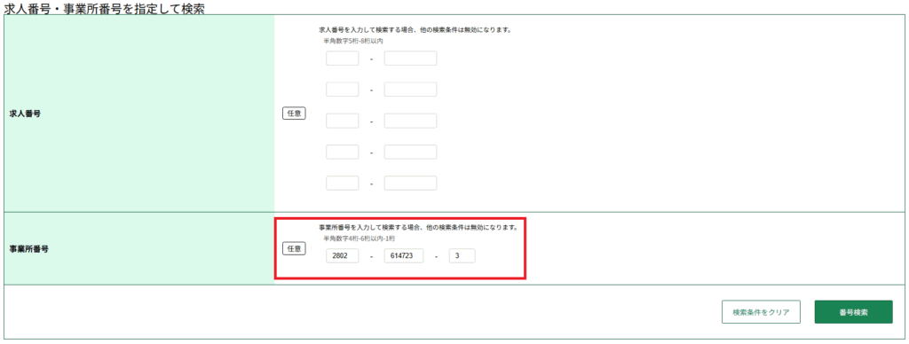 ページ下部の「求人番号・事業所番号を指定して検索」の「事業所番号」に「2802-614723-3」を入力し、ページ右下緑色の「番号検索」を押下すると、弊社で募集中の求人一覧が表示されます。